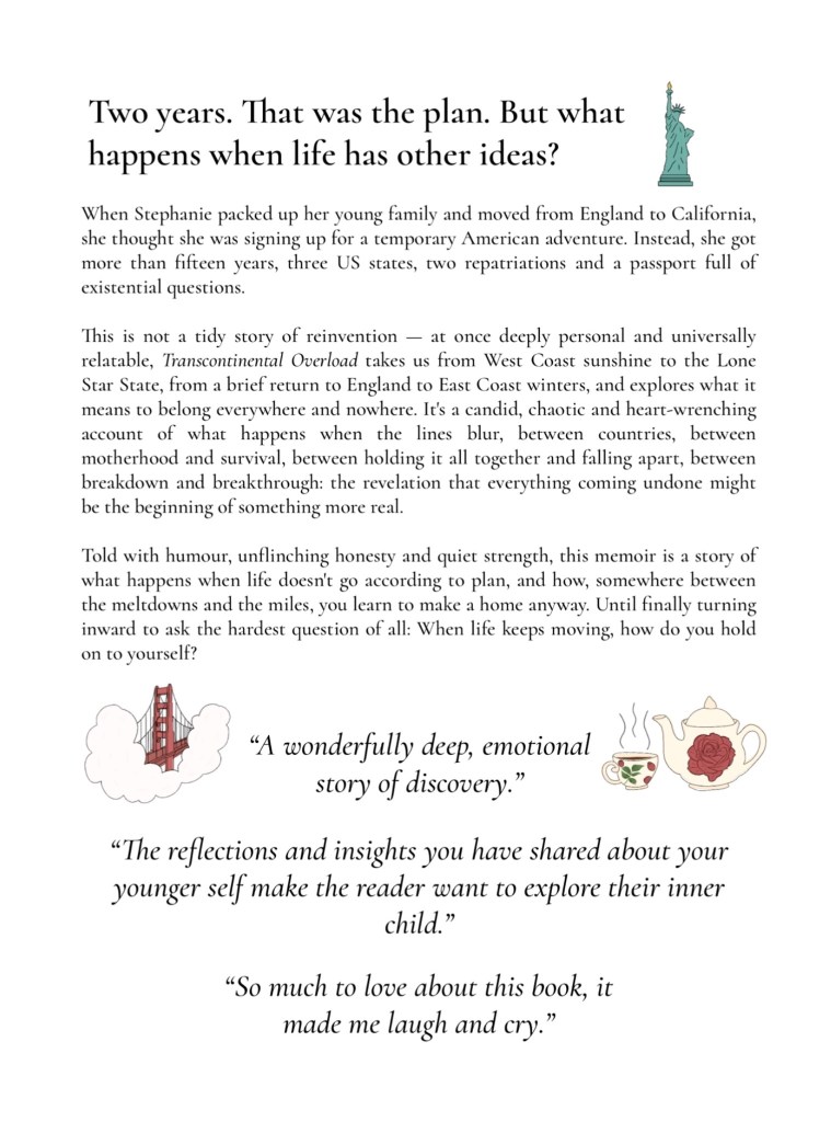 “Transcontinental Overload isn’t just another expat memoir, it’s a beautifully written account of what happens when a temporary adventure becomes a lifelong journey. The story starts with a move from England to California, then onto Texas, and finally to the east coast and New Jersey (with a brief return to England), but what stays constant is the author’s sharp eye for cultural nuance and her ability to find meaning in all the chaos. There’s no gloss here, just truth, and it’s what makes the book so relatable. By the end, you feel like you’ve lived every move, meltdown, and moment of grace alongside her. Really enjoyed it!”